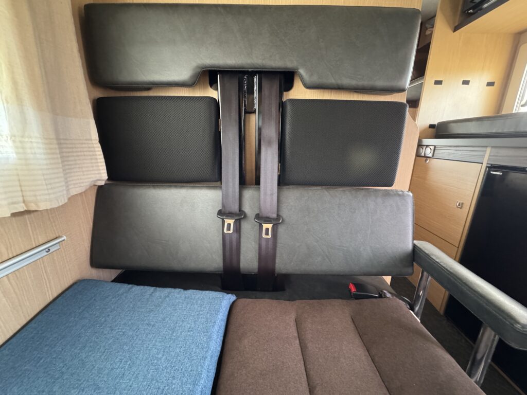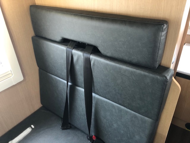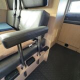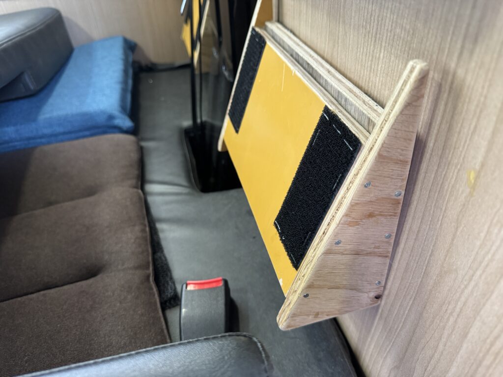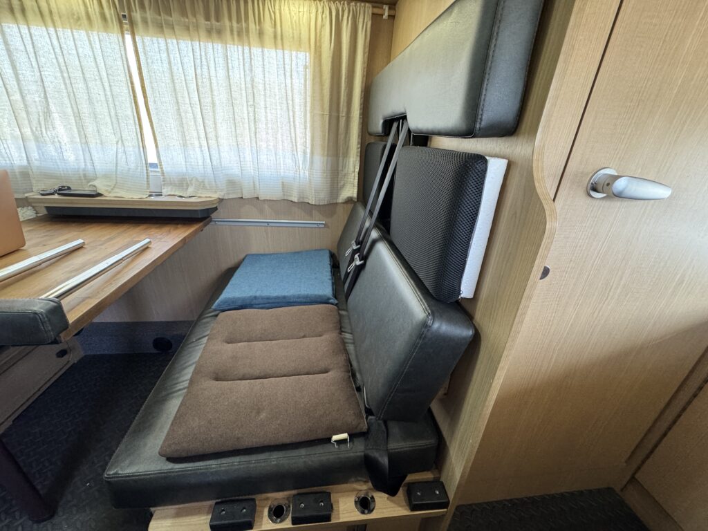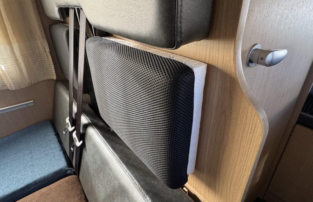 走行中、このシートで寛ごうとしても、直角すぎる背もたれでは腰が落ち着かず、長時間の着座は非常に疲れます。市販のさまざまなクッションを試しましたが、どれも根本的な解決には至りませんでした。他のキャンピングカーに角度調整機能付きのシートがあるのを見ると、「なんとかしたい!」という思いが募るばかりでした。
