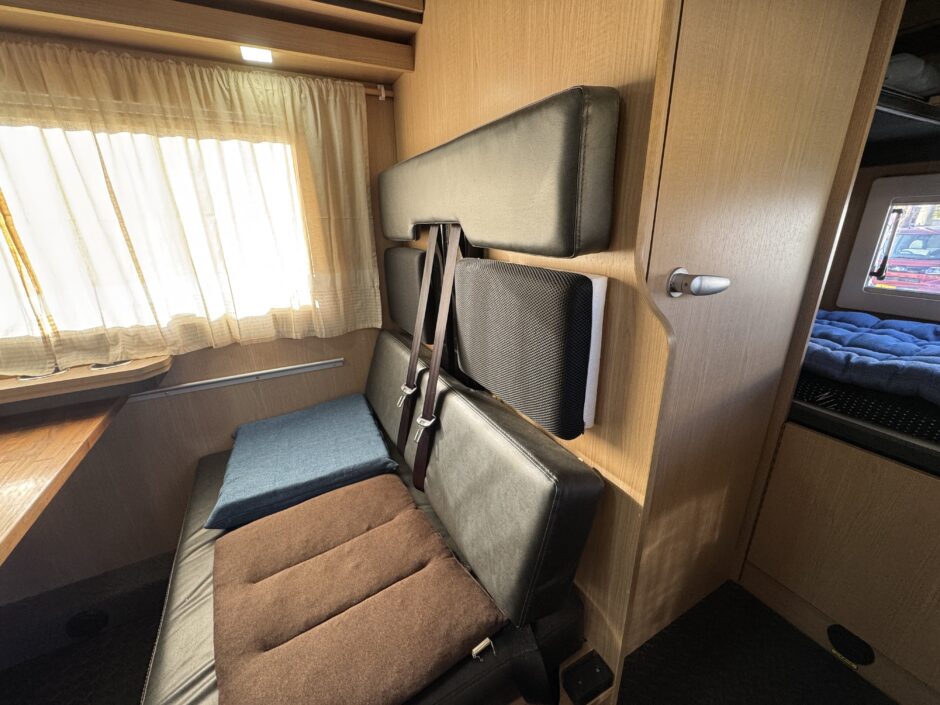 走行中、このシートで寛ごうとしても、直角すぎる背もたれでは腰が落ち着かず、長時間の着座は非常に疲れます。市販のさまざまなクッションを試しましたが、どれも根本的な解決には至りませんでした。他のキャンピングカーに角度調整機能付きのシートがあるのを見ると、「なんとかしたい!」という思いが募るばかりでした。